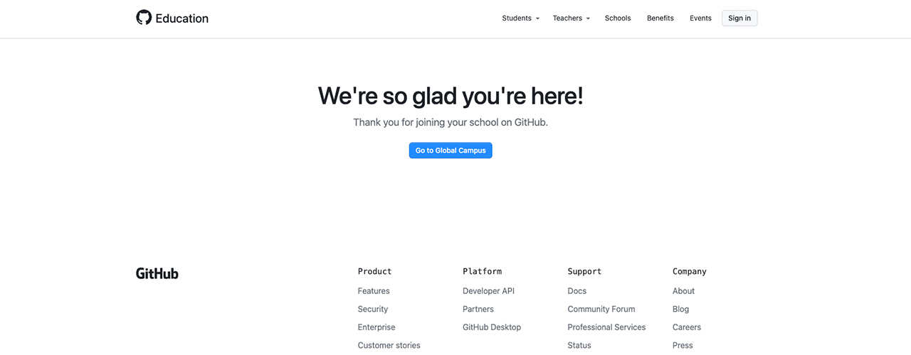 ❗ DO NOT CLICK ON ANYTHING! There is no need to click the Go to Global Campus button. By simply entering the URL in your browser you received access to the Student Developer pack immediately.