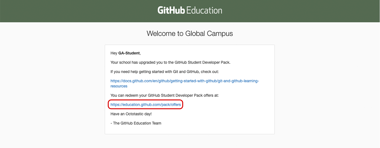 By now you’ll have received a unique URL that starts with https://education.github.com/student/