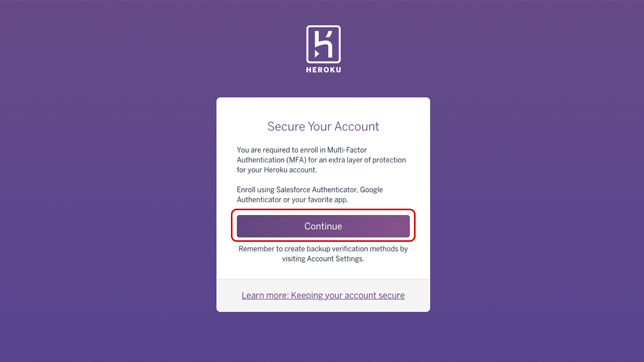 Next, you’ll be asked to set up Multi-Factor Authentication. Click the Continue button.
