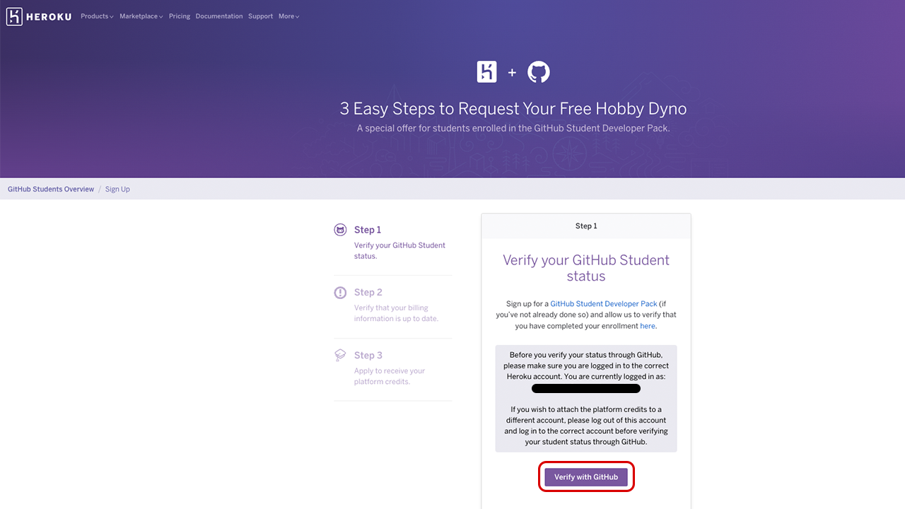 You’ll now be taken to the application menu. You’ll return here several times. On this page you must first click Verify with GitHub to link your personal GitHub account (now registered with GitHub Campus) with Heroku.