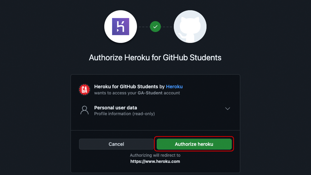 The standard GitHub authorization page will appear. Click Authorize Heroku to link your accounts. This will verify you are a student and allow you to deploy projects directly from your GitHub repositories.