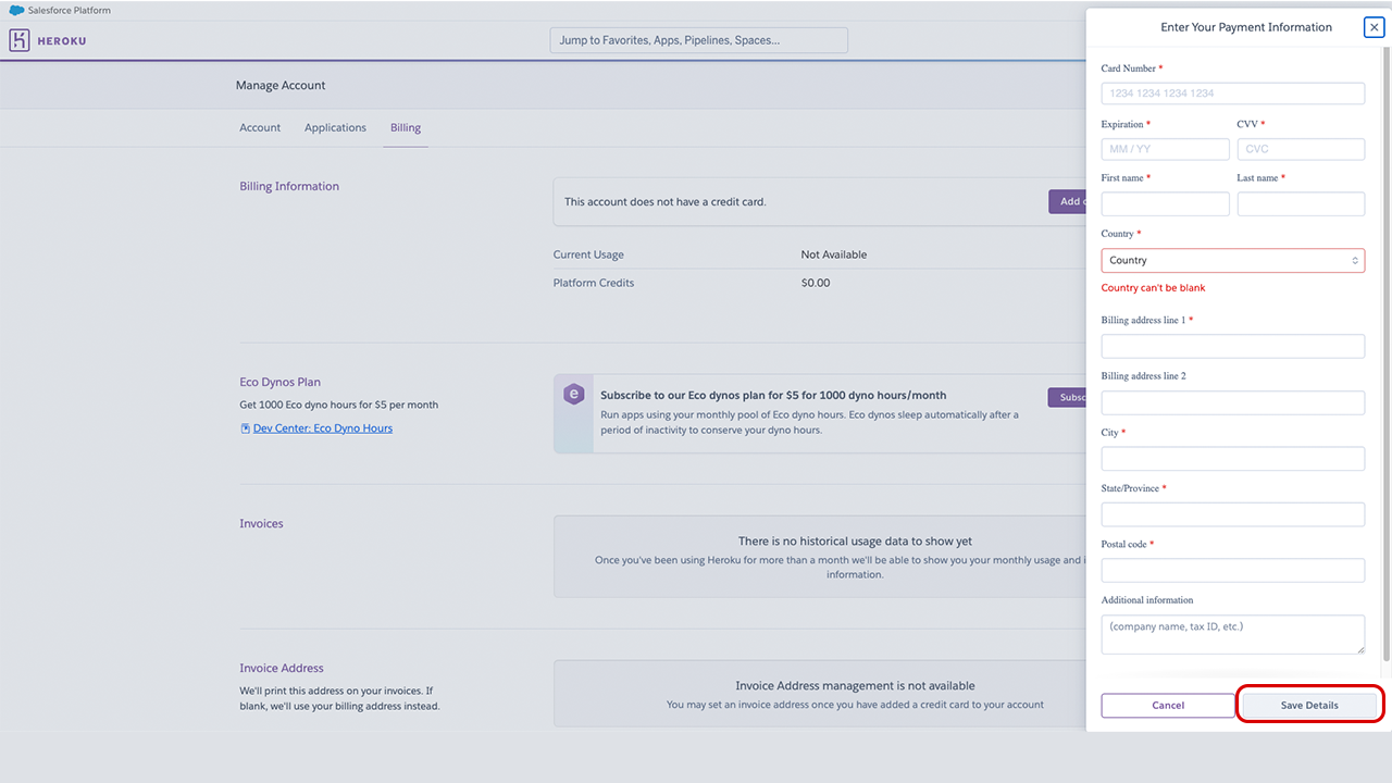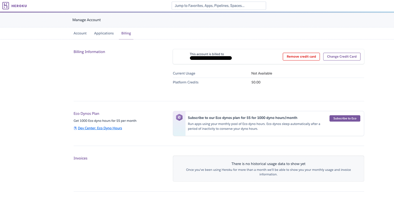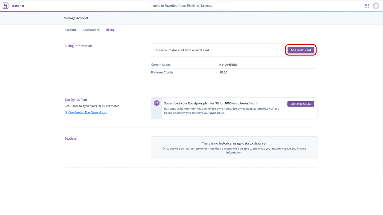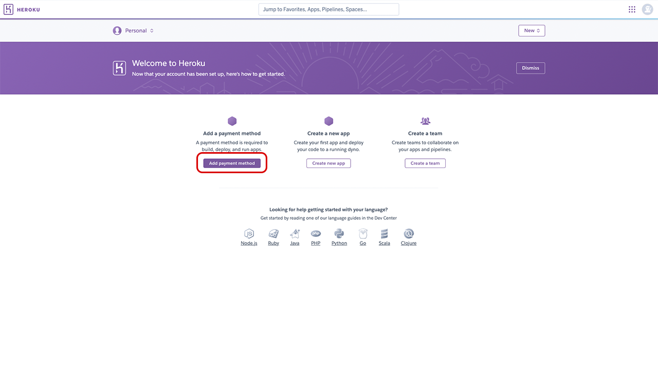 You’ll get directed to your personal Heroku dashboard. We’ll visit this again later. For now, select Add payment method.