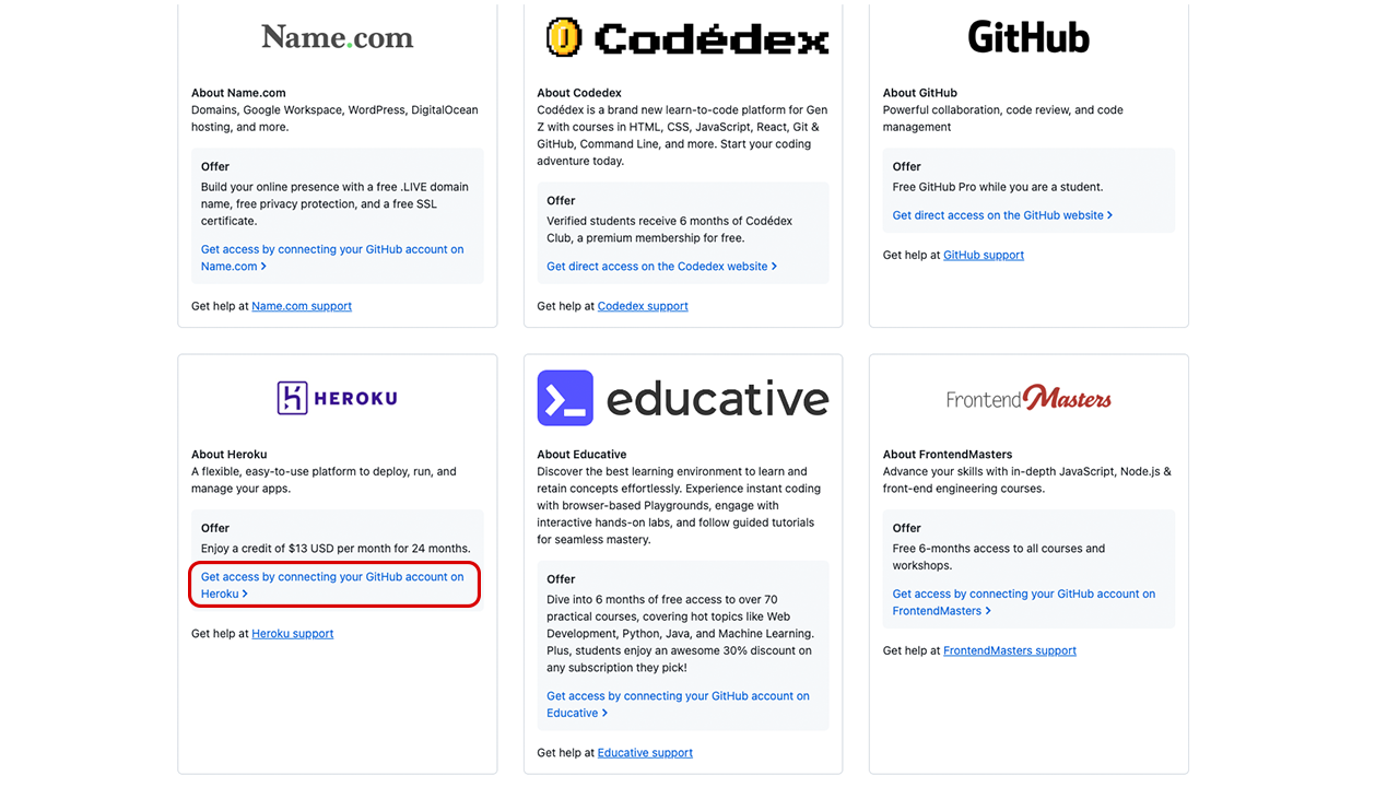 Scroll down the page until you see the Heroku card, and then click the Get access by connecting your GitHub account on Heroku link.