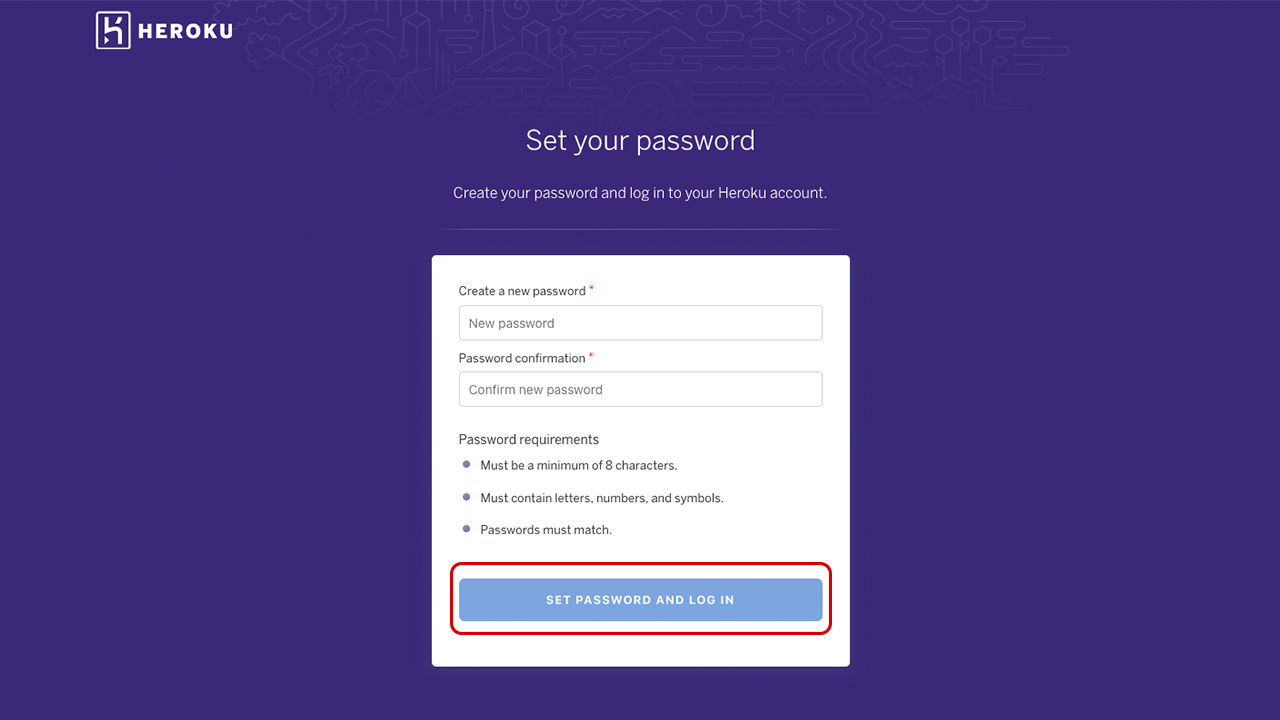 The email will open a new Heroku tab in your browser. You can now close out of the previous tab. In the new tab, you’re prompted to create a password. Once you create your password click the Set Password and Log In button.